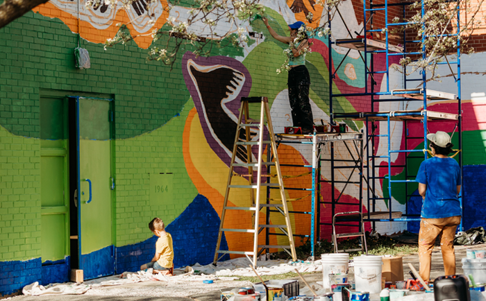 Students working on the mural